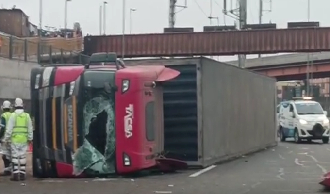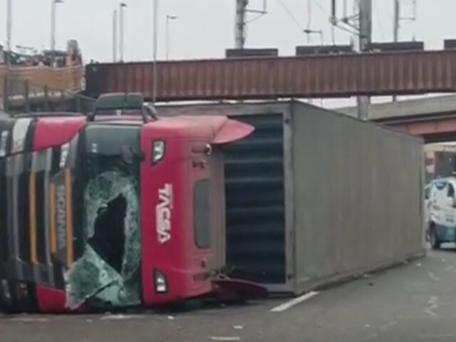 En horas de la tarde de este lunes 8 de setiembre, un camión que transportaba aceite vegetal terminó volcándose en la vía de la Línea Amarilla, a pocos metros del puente Caquetá, en el Cercado de Lima.