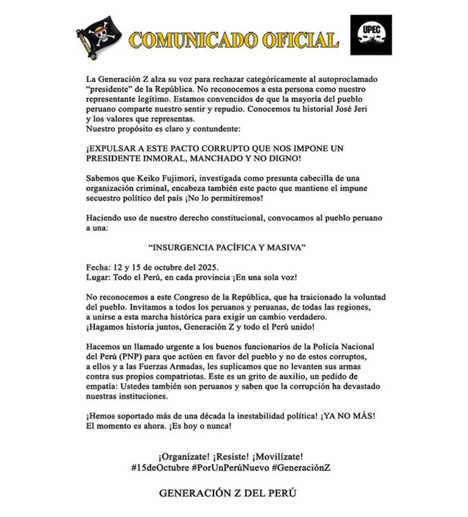 "No reconocemos a este Congreso, que ha traicionado la voluntad del pueblo. Invitamos a todos los peruanos, de todas las regiones a unirse a esta marcha para exigir un cambio verdadero. ¡Hagamos historia, Generación Z y todo el Perú unido!", indican.
