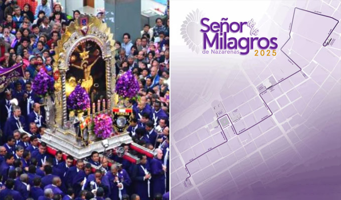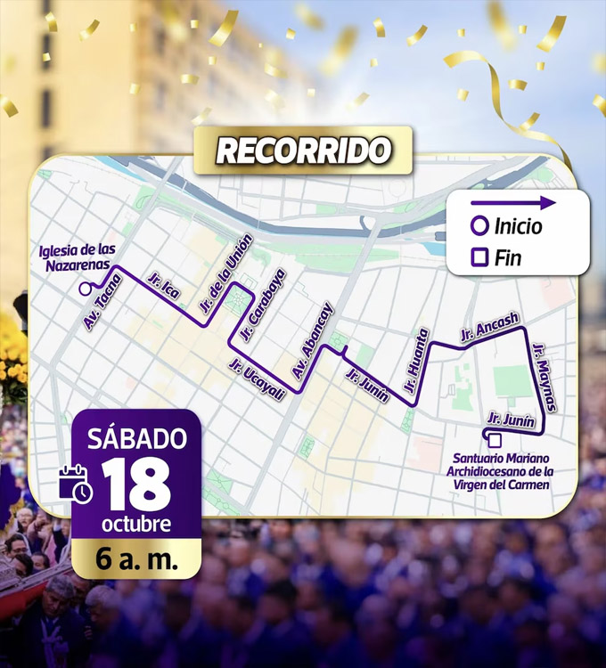 Luego recorrerá los jirones Junín, Áncash y Maynas, antes de regresar al jirón Junín, para llegar al Santuario Mariano de la Virgen del Carmen, donde la sagrada imagen del Cristo de Pachacamilla descansará hasta la siguiente procesión.
