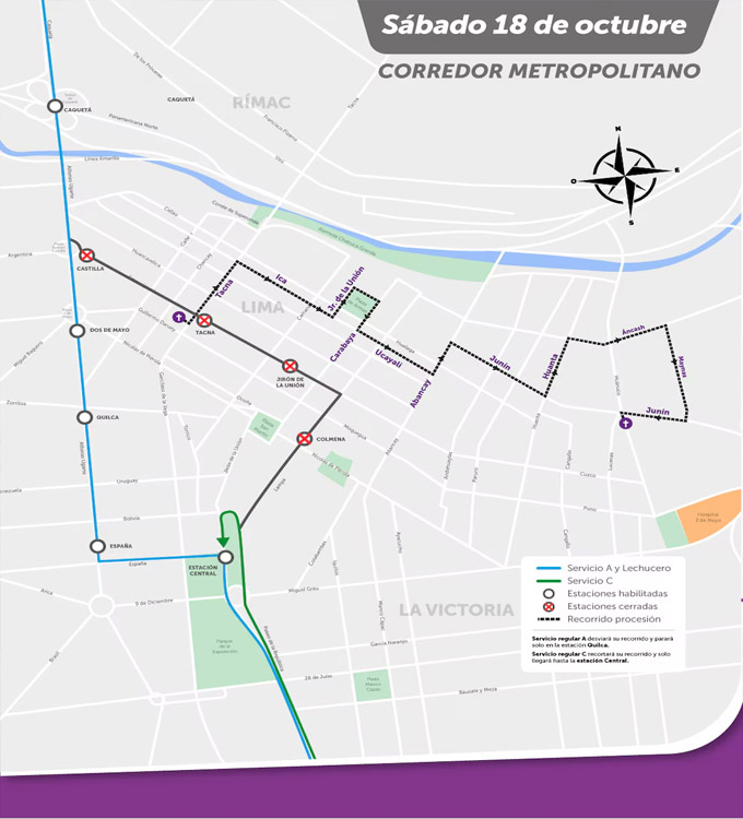 Por la procesión, la Autoridad de Transporte Público de Lima y Callao (ATU) implementó un plan de desvío para los distintos servicios, como el Metropolitano y los corredores complementarios, así como para el transporte público convencional.