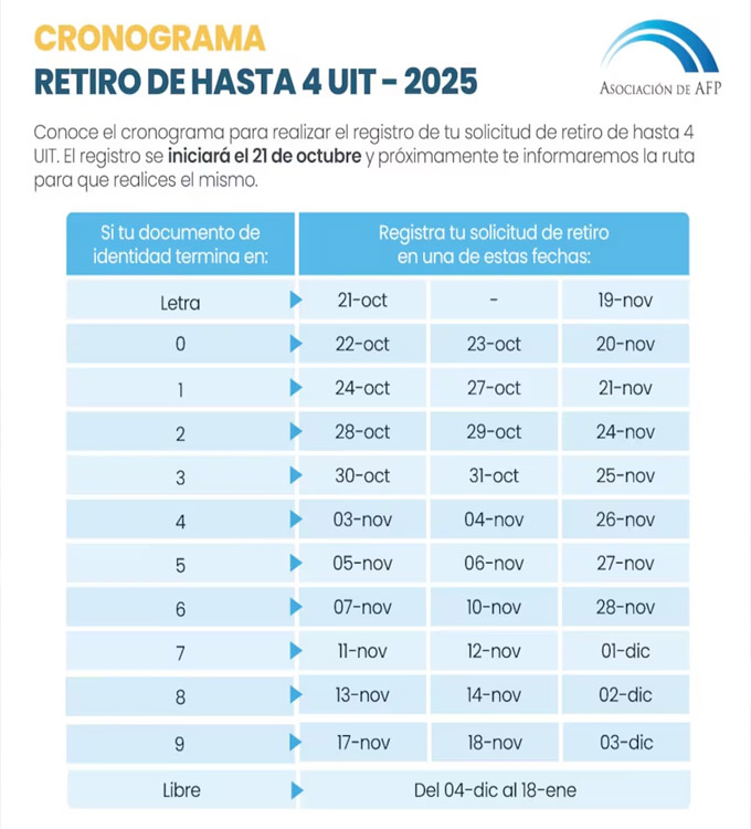 ATENCIÓN. Si tu DNI termina en 0, debes registrar tu solicitud, para el retiro de hasta 4 UIT (equivalente a S/ 21,400) de tus aportes, el miércoles 22 y jueves 23 de octubre. No debes olvidar que el proceso es solo digital, todo empieza ingresando a la plataforma de tu AFP, donde te identificas con tu DNI y contraseña.