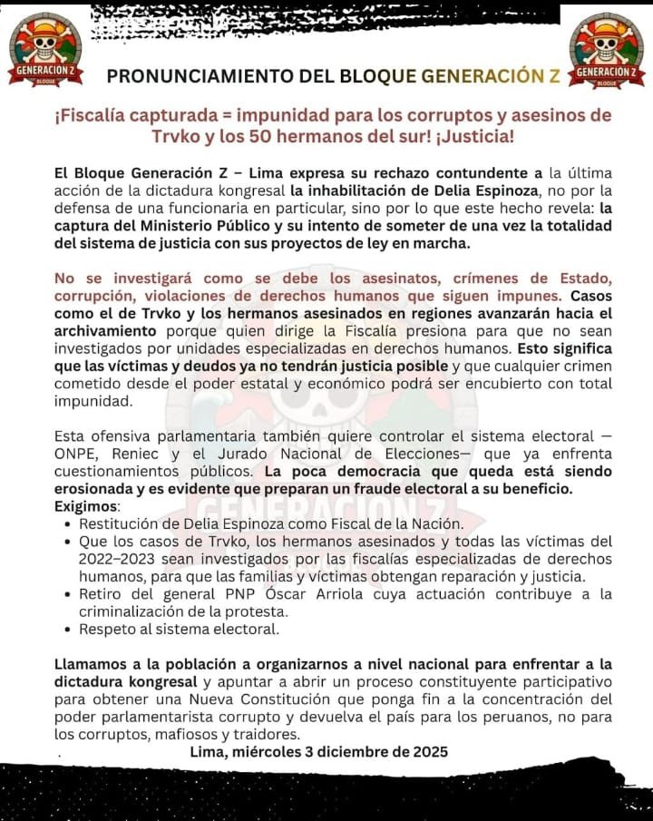 El Bloque “Generación Z” en Lima emitió un pronunciamiento rechazando la reciente inhabilitación de la fiscal Delia Espinoza y denunciando lo que califican como una “captura del Ministerio Público” por parte del Congreso. Según el grupo, esta medida evidencia un intento de someter al sistema de justicia y garantizar impunidad para casos de corrupción, crímenes de Estado y asesinatos en el sur del país, así como también el de ‘Trvko’, todos durante manifestaciones.