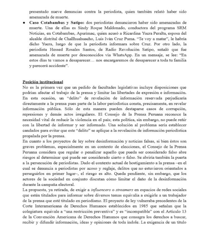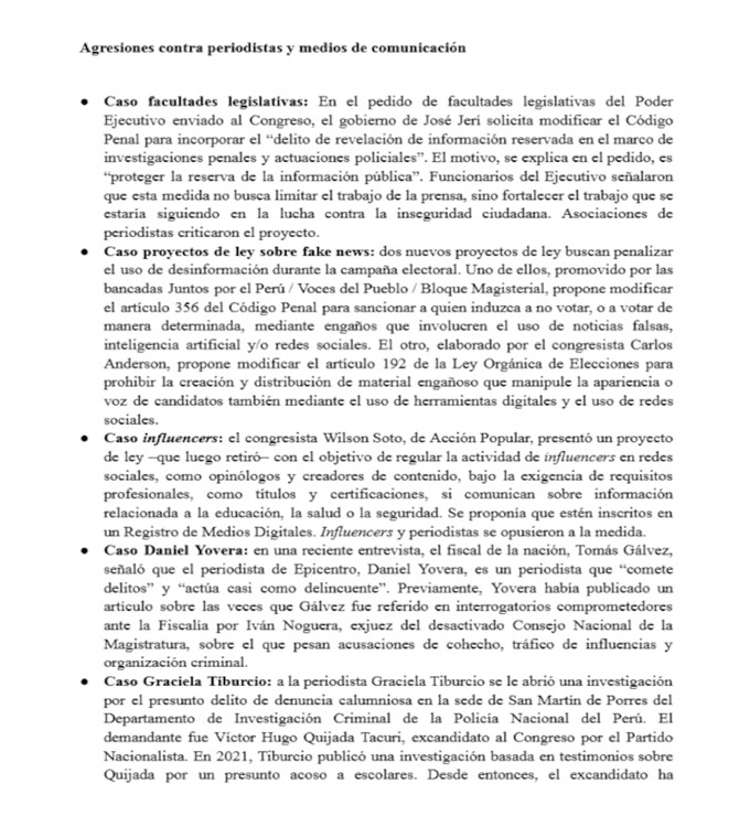 En el documento se pone como ejemplo el pedido del Ejecutivo al Congreso para incluir en el Código Penal el “delito de revelación de información reservada” en investigaciones policiales y fiscales, lo que generó críticas pues podría afectar la labor periodística.