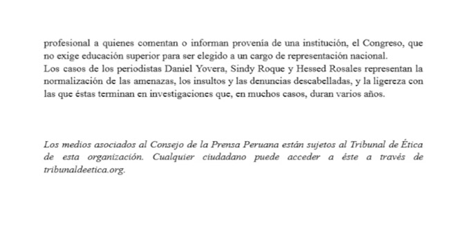 El Consejo de la Prensa Peruana (CPP) publicó su informe correspondiente al mes de noviembre, en el que identifica alarmantes medidas y situaciones que se han presentado y que podrían afectar considerablemente la libertad de expresión en nuestro país.