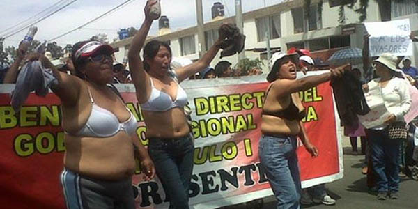 Un grupo de mujeres decidió despojarse de sus vestimentas frente al local del Gobierno Regional de Tacna, exigiendo al presidente Tito Chocano, cumplir con entregar los terrenos promovidos por su gestión.