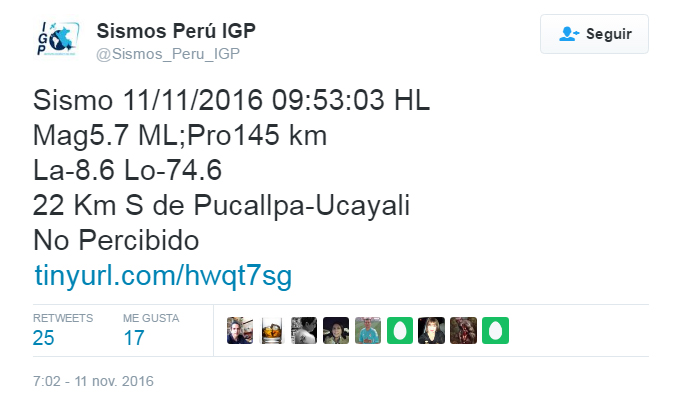 De acuerdo al IGP, el temblor sucedió a las 09:53 horas de esta mañana y tuvo su epicentro a 22 kilómetros al sur de Pucallpa, capital del departamento de Ucayali, con una profundidad de 145 kilómetros.