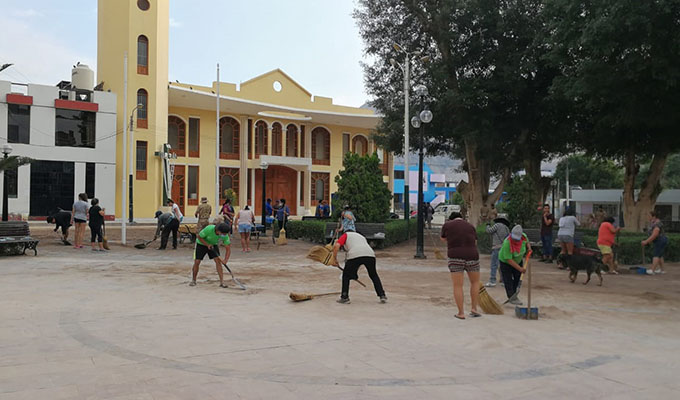 Hombres, mujeres y niños con escobas, palas y recogedores, junto a personal del Ejército, desde muy temprano iniciaron la limpieza de su emblemática plaza, cuyas bancas, árboles y la capilla resultaron afectadas por el desplazamiento de lodo y piedras.