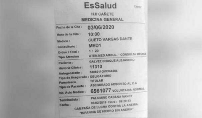 El Seguro Social de Salud (EsSalud) se pronunció tras la difusión de una imagen en redes, donde se da cuenta una cita programada en el área de Medicina General a un asegurado para el 2020, en Cañete.