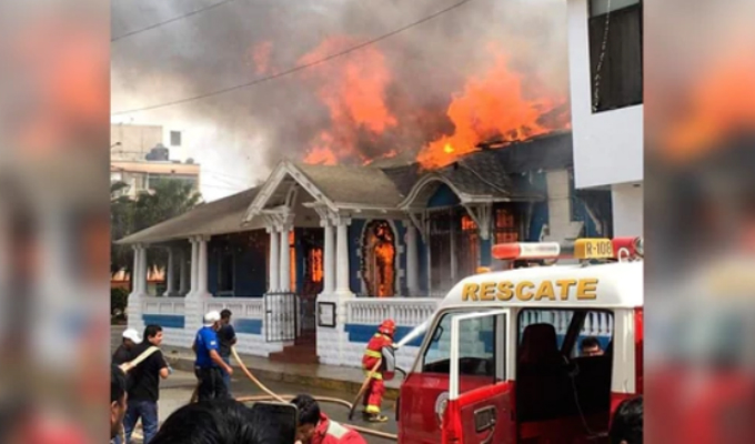Este viernes, un voraz incendio destruyó la Casona Zoeger, construida en 1920 con material rústico, ubicada en el distrito de Pimentel, en la región Lambayeque. El histórico inmueble quedó reducido a escombros.