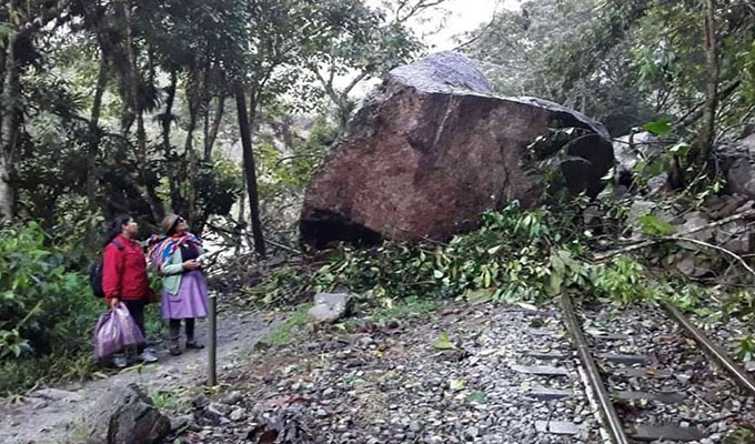 Esta mañana, una inmensa roca de tres metros de altura se desprendió de un cerro y cayó sobre la vía férrea Machu Picchu-Hidroeléctrica e interrumpió el paso de los trenes en el Cusco.
