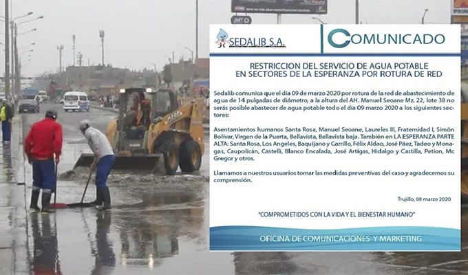Según la empresa de agua Sedalib, este problema se inició por una rotura en la red de abastecimiento del Asentamiento Humano Manuel Seoane registrado el 9 de marzo.