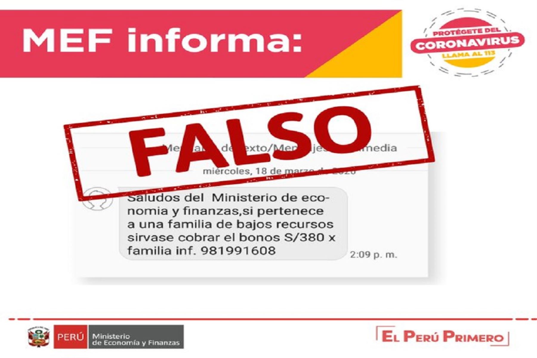 El Ministerio de Economía y Finanzas (MEF) calificó como falsa una supuesta información que viene circulando en redes sociales, la cual precisa un número telefónico para acceder al bono de S/.380 dirigido a familias vulnerables durante el período de emergencia nacional.