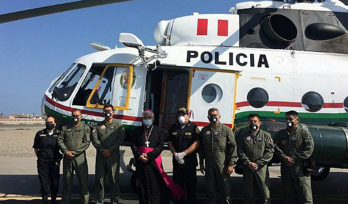 Un hecho histórico. En un helicóptero de la Policía Nacional del Perú (PNP), la venerada imagen de la Virgen del Socorro de Huanchaco recorrió hoy la ciudad de Trujillo y sus alrededores para derramar bendiciones a sus fieles debido a la crisis sanitaria por el nuevo coronavirus.