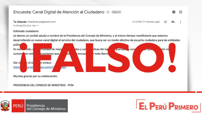 PCM alerta sobre correo con información falsa para encuesta