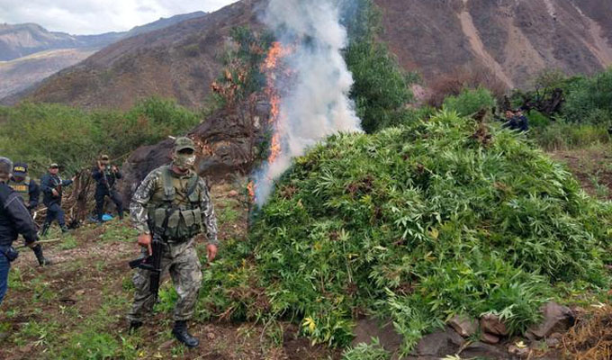 En un operativo conjunto, miembros de las Fuerzas Armadas y la Policía Nacional, encontraron más de 250 mil plantones de marihuana, en el centro poblado Amaru Pampa, provincia de La Mar, en Ayacucho. En ese lugar también se destruyeron laboratorios clandestinos destinados a la elaboración de droga.