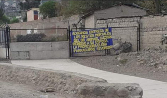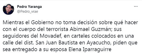 "Mientras el Gobierno no toma decisión sobre qué hacer con el cuerpo del terrorista Abimael Guzmán; sus seguidores del Movadef, en carteles colocados en una calle del dist. San Juan Bautista en Ayacucho, piden que sea entregado a su esposa Elena Iparraguirre", publicó el usuario Pedro Yaranga.