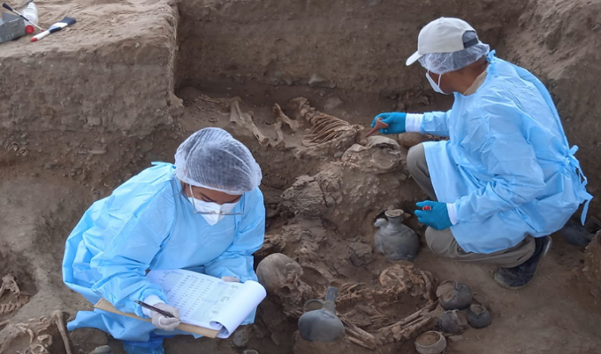 Los investigadores informaron que, este hallazgo tuvo lugar hace tres semanas, en la cuarta temporada de trabajos de la muralla sur de Chan Chan. Cuando en un área de 10 metros cuadrados, se encontraron los restos óseos dispuestos en dos niveles del terraplén, acompañados de aproximadamente 70 vasijas y objetos relacionados al trabajo textil.