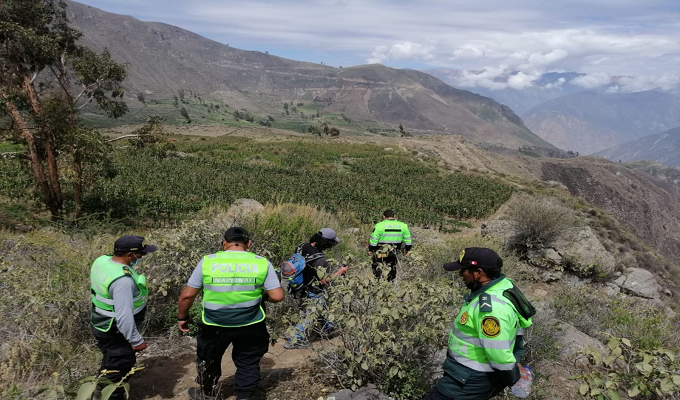 Las labores de búsqueda de la turista de nacionalidad belga Natacha de Crombrugghe, en el valle del Colca, provincia de Caylloma, región Arequipa, y del adolescente Kevin Ramos, quien cayó a las aguas del río Colca, continúan a cargo de 30 efectivos policiales.