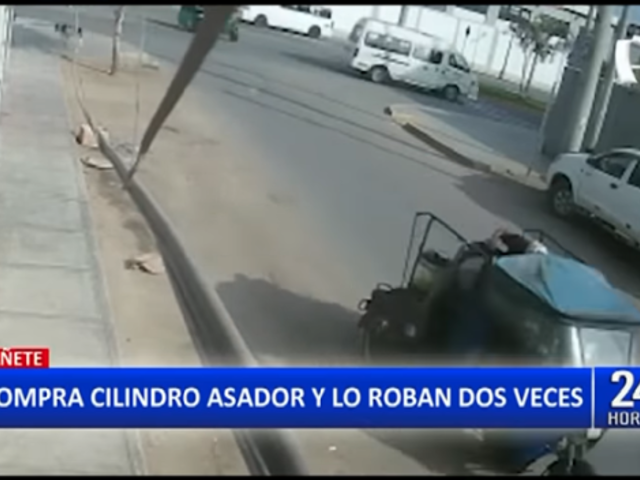 En Cañete, cámaras de seguridad de la zona, captaron el momento exacto cuando dos sujetos a bordo de una mototaxi se llevan un cilindro asador, herramienta de trabajo de una comerciante dedicada a la venta de pollo y chancho al cilindro.