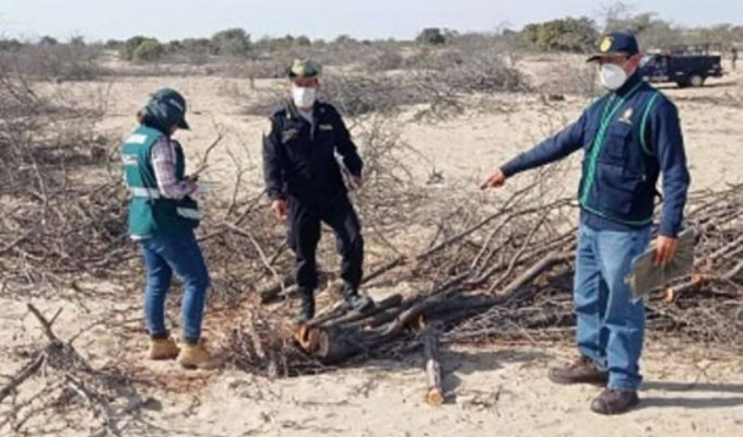 Durante la diligencia fiscal, en el sector Vega del Caballo, se intervino una hectárea donde se apilaban 7.5 metros cúbicos de madera rolliza de algarrobo. No se encontró a las personas responsables de la ilegal actividad, informó el Ministerio Público.