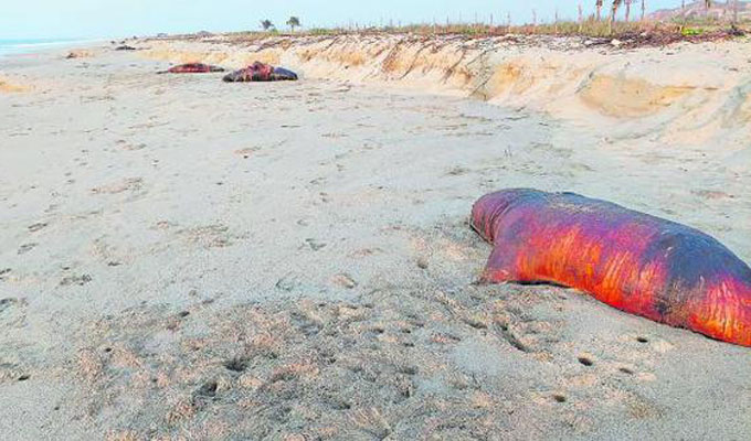El hallazgo se produjo la tarde del último sábado en el sector Los Cerezos del balneario cruceño. Los estudiantes pidieron a las autoridades que hagan una fosa y sepulten a estos animales marinos a la brevedad posible, ya que se encuentran en estado de putrefacción y eso atenta contra la salud de los bañistas.