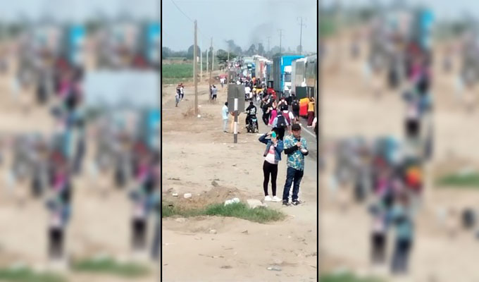 Ante el bloqueo de la carretera Panamericana Norte, a la altura de la provincia de Virú, en la región La Libertad, cientos de pasajeros de buses que quedaron detenidos, decidieron caminar cargando sus maletas y otras pertenencias hacia la ciudad más cercana.