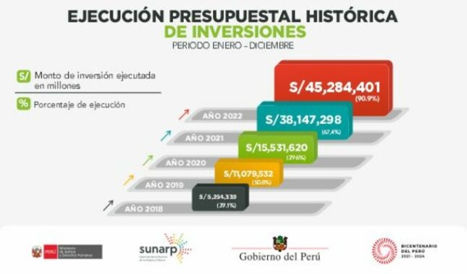 Con una visión integradora y multisectorial, a efectos de mejorar la calidad y eficiencia del servicio al ciudadano, la Superintendencia Nacional de los Registros Públicos (Sunarp), logró una ejecución presupuestal histórica en inversiones, de acuerdo al portal de Consulta Amigable del Ministerio de Economía y Finanzas (MEF), cumpliendo así las metas establecidas para el año fiscal 2022.