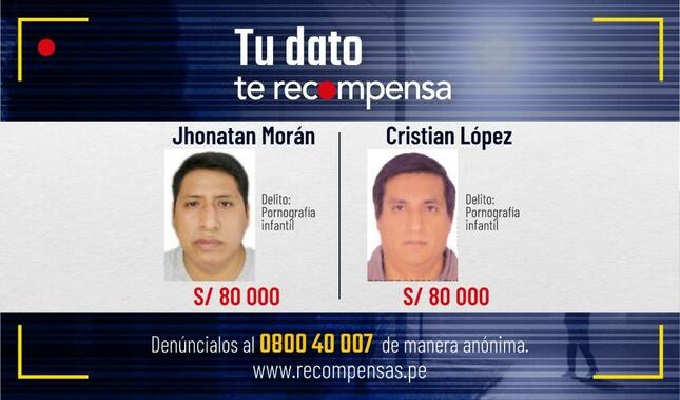 Entre los requisitoriados por el delito de pornografía infantil se encuentra Jhonatan Morán Quispe y Cristian López Rondán, por quienes se ofrece una recompensan de S/ 80 000. Los sujetos fueron sentenciados en Lima por poseer, almacenar y distribuir, a nivel internacional, material pornográfico de menores de sexo femenino.