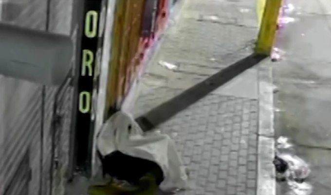 En las imágenes se observa al hampón durmiendo con una frazada en la vereda de la calle a pocos metros del establecimiento. Con el paso de los minutos y al observar que nadie transitaba comienza a ejecutar su plan.