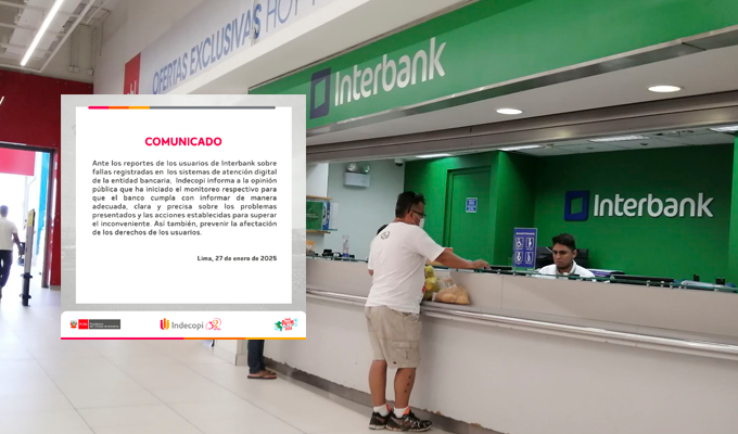 Con un comunicado publicado en las redes sociales del Indecopi se alcanza a leer el siguiente mensaje: “Ante los reportes de los usuarios de Interbank sobre fallas registradas en los sistemas de atención digital de la entidad bancaría”.
