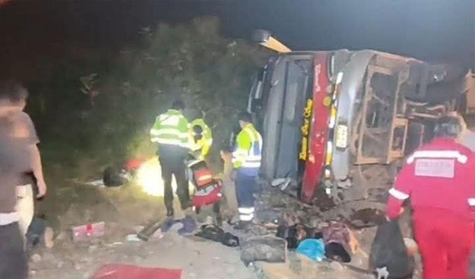 Según primeros informes, esta madrugada un ómnibus interprovincial se volcó a la altura del kilómetro 192 de la carretera de la Panamericana Sur, en el sector Tambo de Mora, en la región Ica.