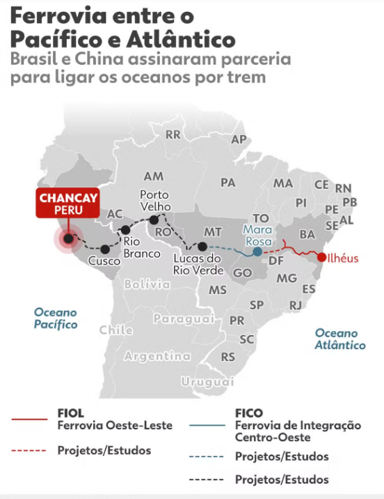 Los gobiernos de Brasil y China firmaron este lunes un memorando de entendimiento para trabajar de manera conjunta en la elaboración de estudios técnicos que evalúen la factibilidad de una línea ferroviaria interoceánica. Esta conexión ferroviaria uniría el puerto brasileño de Ilheus, en el estado de Bahía, con el puerto de Chancay, en Perú, atravesando cinco estados brasileños antes de llegar al país andino. El objetivo de esta iniciativa es optimizar las exportaciones hacia Asia, particularmente hacia el mercado chino.