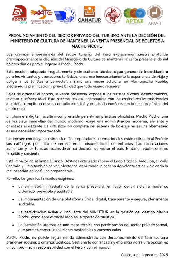 Los gremios advierten que la venta directa expone a los visitantes a largas colas, desinformación y reventa, lo que va en contra de los estándares de un destino con reconocimiento global. Califican la decisión de “obsoleta” en plena era digital y piden una gestión más moderna y transparente. Asu vez, cuestionan la exclusión del Mincetur en la toma de decisiones.