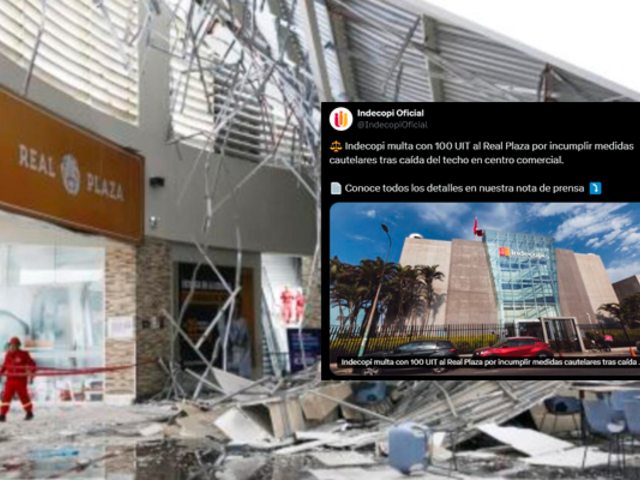 La Oficina Regional del Indecopi en La Libertad resolvió aplicar una sanción coercitiva contra la empresa Real Plaza S.R.L. por no acreditar en su totalidad el cumplimiento de las disposiciones dictadas luego del colapso del techo del patio de comidas ocurrido el pasado 21 de febrero en el centro comercial de Trujillo. Según el comunicado, “se impuso una multa coercitiva de 100 UIT, equivalente a S/ 535 000, por no acreditar de manera oportuna y total el cumplimiento de las medidas cautelares dictadas para proteger a los consumidores afectados”. La entidad recordó que este tipo de sanción “es inapelable, conforme a lo contemplado en el Código de Protección y Defensa del Consumidor”.