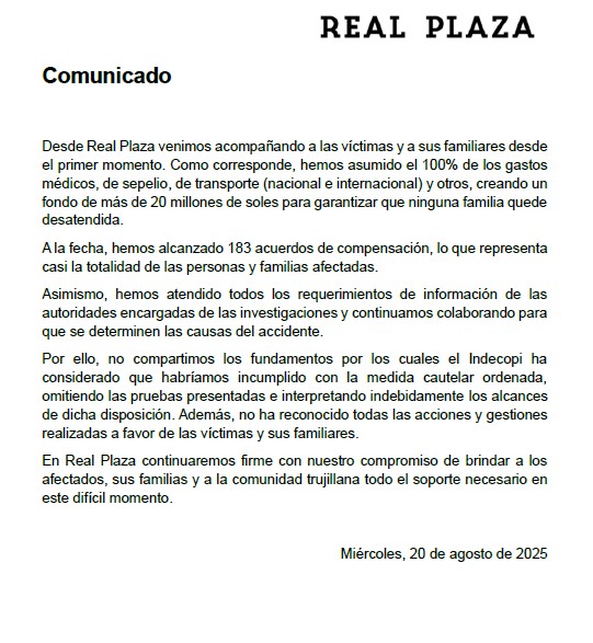 Por su parte, el centro comercial Real Plaza emitió el siguiente comunicado: