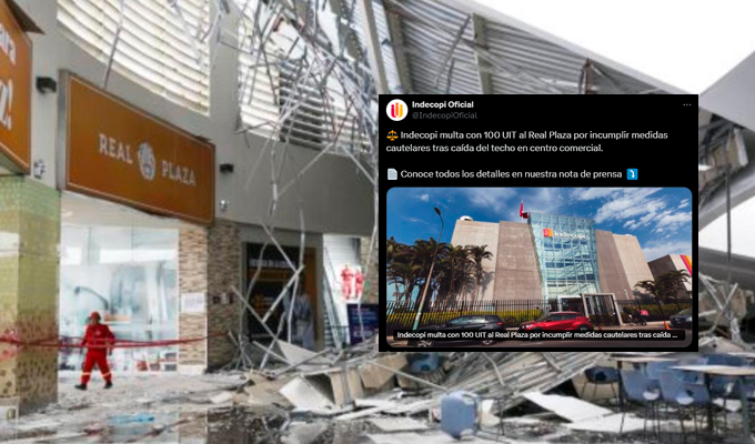 La Oficina Regional del Indecopi en La Libertad resolvió aplicar una sanción coercitiva contra la empresa Real Plaza S.R.L. por no acreditar en su totalidad el cumplimiento de las disposiciones dictadas luego del colapso del techo del patio de comidas ocurrido el pasado 21 de febrero en el centro comercial de Trujillo. Según el comunicado, “se impuso una multa coercitiva de 100 UIT, equivalente a S/ 535 000, por no acreditar de manera oportuna y total el cumplimiento de las medidas cautelares dictadas para proteger a los consumidores afectados”. La entidad recordó que este tipo de sanción “es inapelable, conforme a lo contemplado en el Código de Protección y Defensa del Consumidor”.