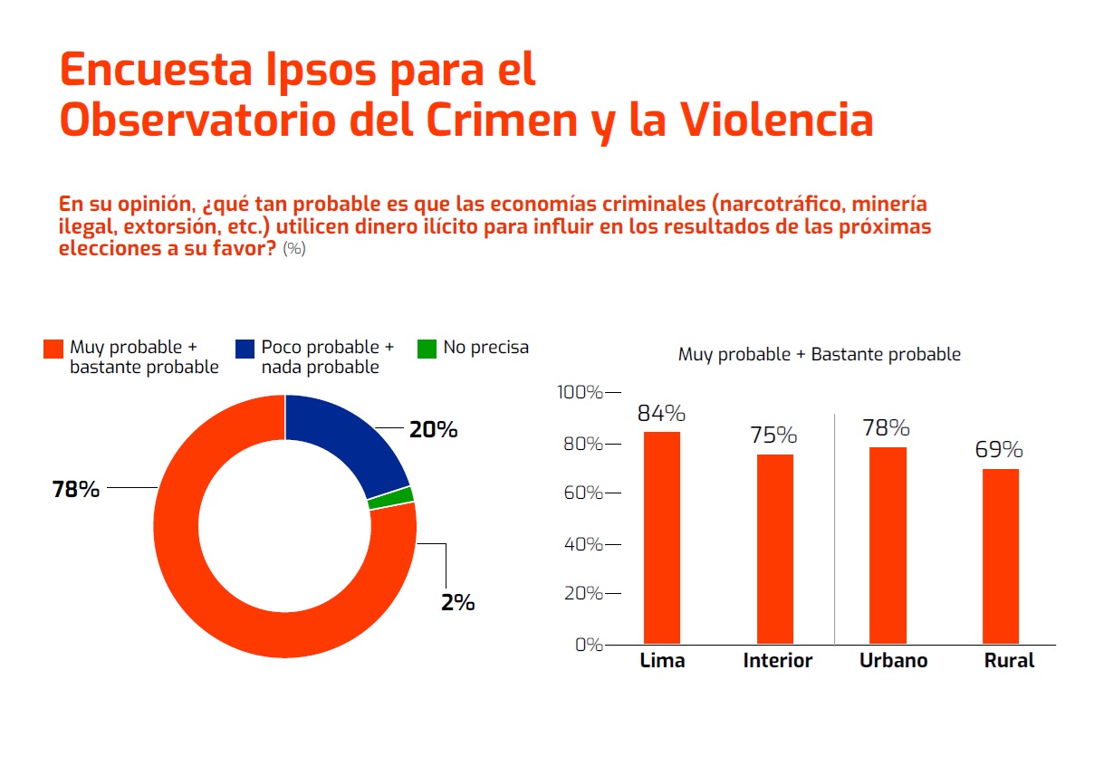 Los limeños son los más escépticos frente a la transparencia del proceso electoral: el 84% considera que es probable que el dinero proveniente del crimen organizado intente influir en los comicios. En el interior del país, el nivel de preocupación es menor, pero también significativo (75%). En las zonas urbanas, el porcentaje alcanza 78%, mientras que en las rurales se sitúa en 69%.