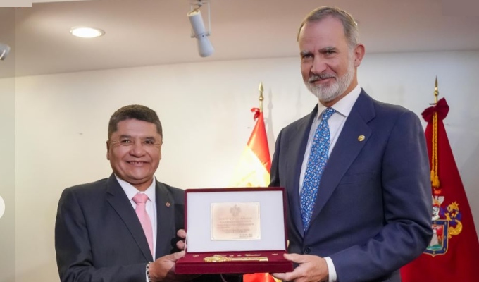 El rey de España, Felipe VI, fue distinguido este miércoles como Huésped Ilustre de Arequipa y recibió las llaves de la ciudad de manos del alcalde Víctor Hugo Rivera. La ceremonia se llevó a cabo en el Teatro Municipal, donde el monarca saludó a las autoridades locales, firmó el libro de oro de visitantes y expresó su gratitud por el reconocimiento. La distinción se realizó horas antes de la inauguración del X Congreso Internacional de la Lengua Española (CILE), que se desarrollará del 14 al 17 de octubre en la ciudad sureña.