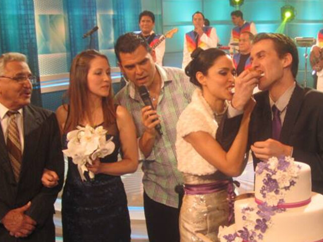 Adriana Quevedo y Nahuel López contrajeron matrimonio civil a las 9 de la mañana en la municipalidad del Rímac. Los recién casados fueron recibidos entre aplausos, parabienes y con el tradicional arroz por el público de Ola ke Ase. La familia Quevedo también se hizo presente para brindar sus mejores deseos a la carismática pareja. Adriana y Nahuel se animaron a bailar el Danubio azul junto a sus testigos de boda.