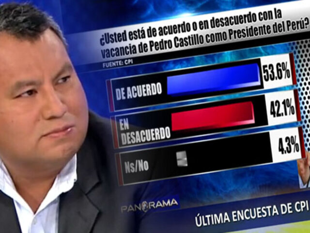 Omar Castro detalló que en esta encuesta existe una diferencia entre las personas que querían la renuncia y las que desean la vacancia presidencial de Pedro Castillo. En el estudio realizado el 53.6 % está de acuerdo con la vacancia, el 42.1 % en desacuerdo, mientras que el 4. 3% no sabe.