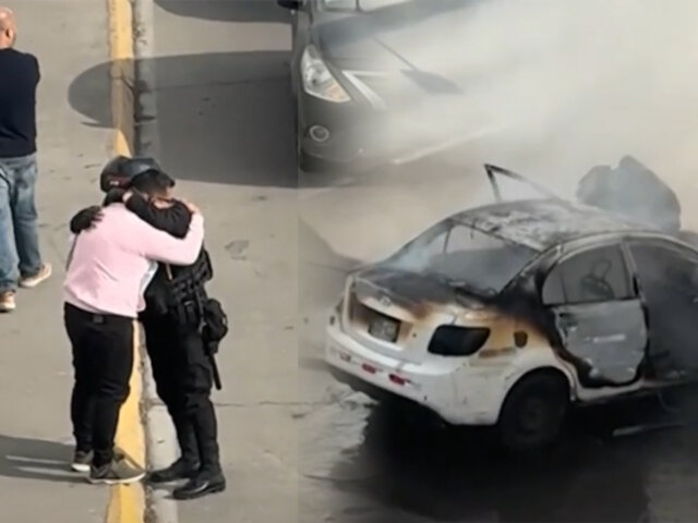 Agente consuela a conductor tras incendio de su auto en Miraflores