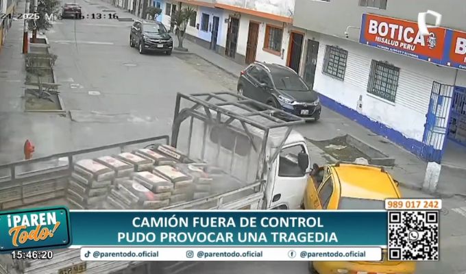 Las cámaras de seguridad del distrito registraron lo ocurrido. La pesada unidad descontrolada inicia su accidentado trayecto chocando con unas rejas, para luego estrellarse contra una mototaxi de color azul que terminó con las puertas abiertas tras el impacto.