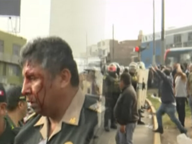 El enfrentamiento escaló cuando algunos manifestantes comenzaron a lanzar desperdicios contra los efectivos. Se presume que producto de esta situación, un objeto le habría caído a un comandante de la PNP que le ocasionó un corte en la cabeza, por lo que fue auxiliado por sus compañeros y trasladado en un patrullero a un hospital cercano.