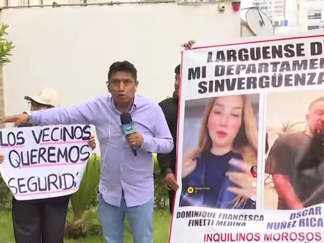 Con carteles en mano, los vecinos entre ellos la madre de la propietaria, denuncia que cuando se les pide que dejen el departamento son insultados y agredidos. Los morosos han sido identificados como Dominique Francesca Finetti Medina y Oscar Núñez Ricardi, según indican serían influencers.