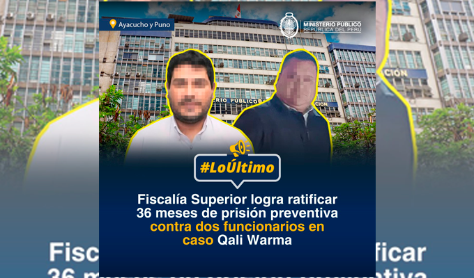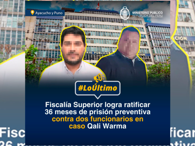 En un avance significativo, la Fiscalía Superior Especializada en Delitos de Corrupción logró confirmar una detención preventiva de 36 meses para dos funcionarios públicos vinculados al caso Qali Warma. Se trata de Bret Matos, especialista alimentario de la Unidad Territorial de Ayacucho, y Ronald Loza, empleado de la Dirección Regional de Salud de Puno, quienes están bajo investigación. "La confirmación de los 36 meses de prisión preventiva refleja nuestro compromiso de erradicar la corrupción", destacó el Ministerio Público en su comunicado.