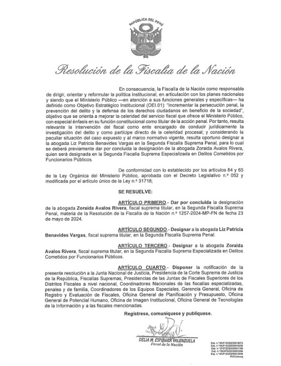 La decisión deja sin efecto el nombramiento de Zoraida Ávalos en la entidad que liderará la exfiscal de la Nación, por lo que Avalos Rivera pasará a la Segunda Fiscalía Suprema Especializada en Delitos Cometidos por Funcionarios Públicos.