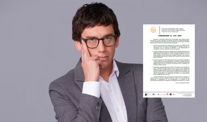 La Policía Nacional del Perú (PNP) emitió un comunicado oficial respecto al fallecimiento del periodista Jaime Miguel Chincha Ravines, ocurrido el 7 de septiembre en Miraflores. Según detalló la institución, “personal de la División de Investigación de Homicidios de la DIRINCRI PNP tomó conocimiento del hecho inmediatamente se constituyó al lugar, en coordinación con la Comisaría de Miraflores y el Departamento de Investigación Criminal, verificando la situación reportada”.
