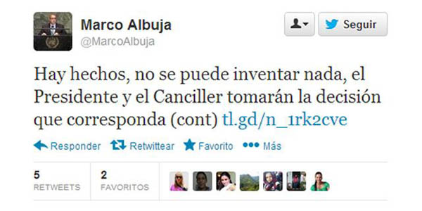 Mediante su Twitter el vicecanciller de Ecuador, Marco Albuja, afirmó que el jefe de Estado, Rafael Correa y el canciller Ricardo Patiño, tomarán una decisión final sobre la situación del embajador Rodrigo Riofrío, destacado en Lima.