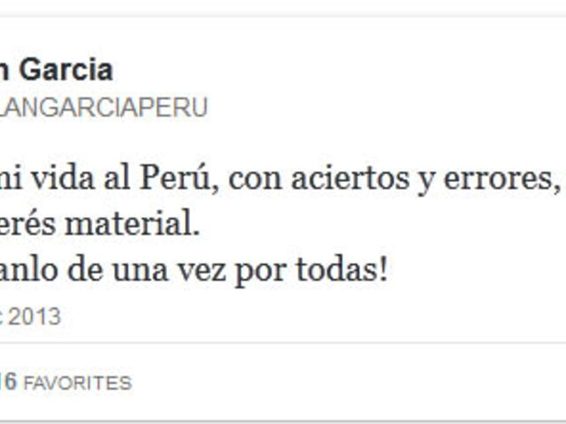 "Tras 10 meses de investigar los últimos 8 años la Fiscalía concluyó que no hay ningún enriquecimiento ilícito", escribió Alan García Pérez y luego añadió en otro tuit, "Entregué mi vida al Perú, con aciertos y errores, pero sin ningún interés material. ¡Entiéndanlo de una vez por todas!".