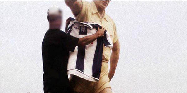 En la página de Facebook, Testigos de una Pasión, apareció publicada esta imagen, en la que se aprecia a un hincha de Alianza Lima trepado a la estatua de Lolo Fernández en el estadio Monumental, con una camiseta blanquiazul, que trata de colocarle al ídolo crema.